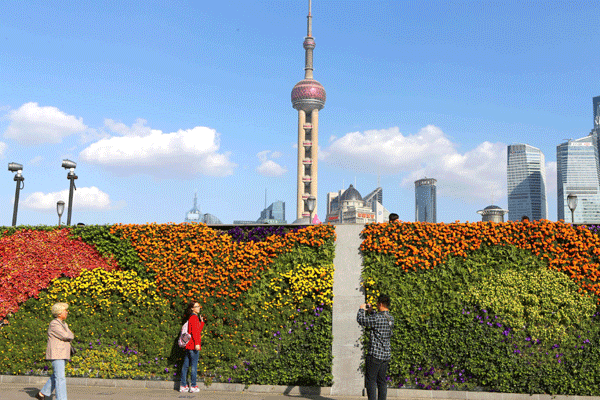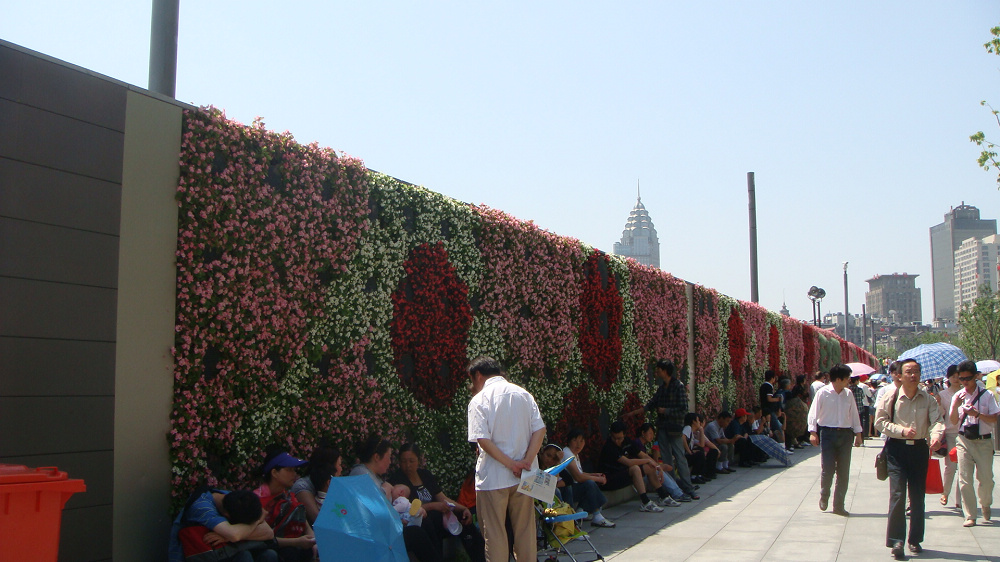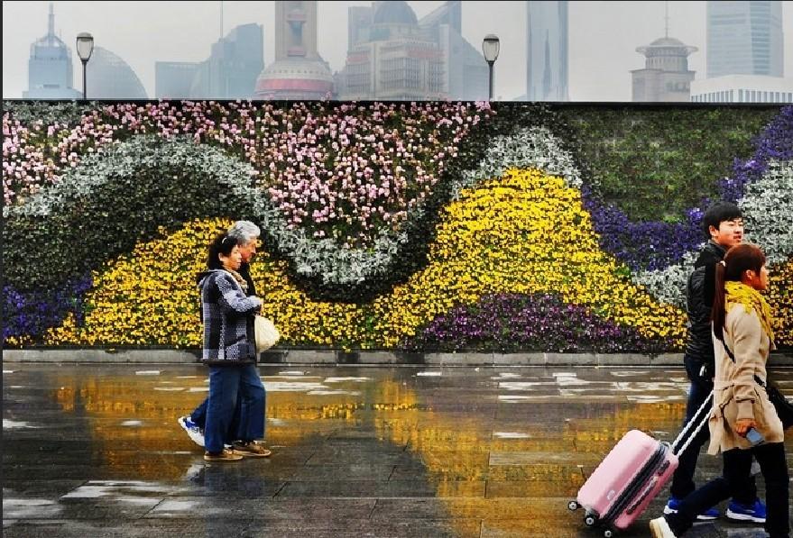 由于陳毅廣場花墻上花的數(shù)量達到了將近萬盆,因此通過角度的調整,也大大減少了工作人員反復澆水的工作量。項目負責人羅先生介紹,在運用了蓄水花墻的原理之后,用于澆灌盆栽的用水量節(jié)省了40%。目前,外灘植被全部采用黃浦江水澆灌。